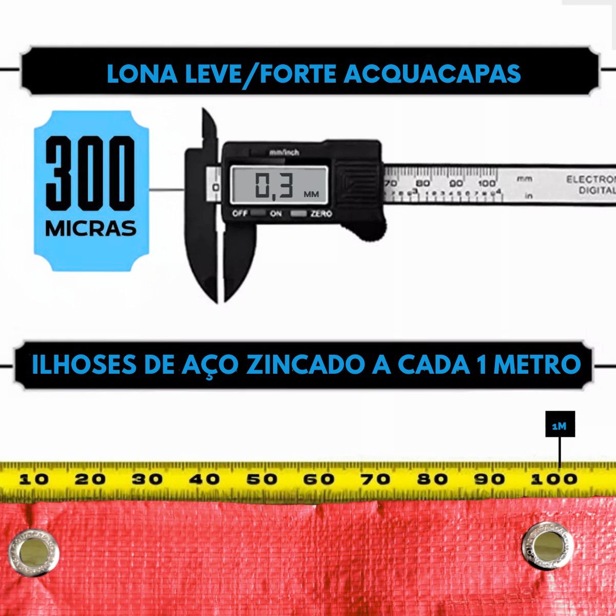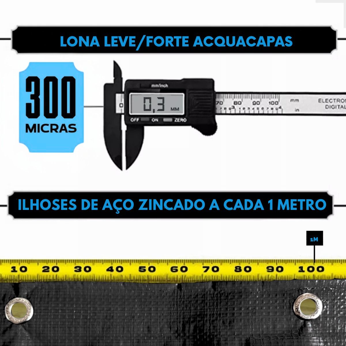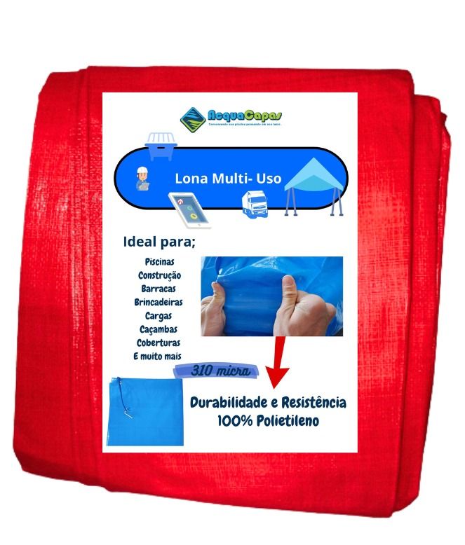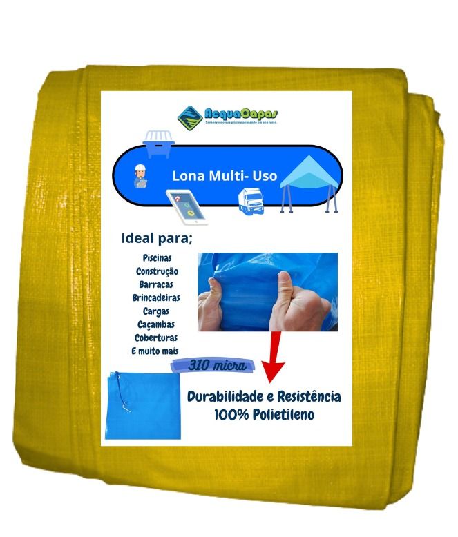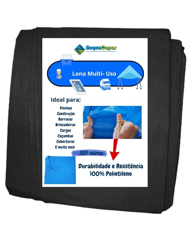 A lona multiuso 300 micras é fabricada em polietileno de alta densidade (PE), com trama interna reforçada e revestimento impermeável, oferecendo leveza, flexibilidade e excelente custo-benefício.